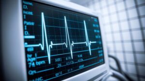 Close-up shot of an electrocardiogram (EKG) machine displaying a heart rhythm. Illustrates modern medical technology for monitoring patient’s vital signs and diagnosing cardiac conditions in healthcare settings. Depicts health, wellness and diagnosis.