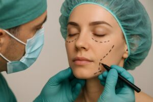 Surgeon wearing surgical mask and gloves drawing marks on woman’s face for cosmetic surgery procedure